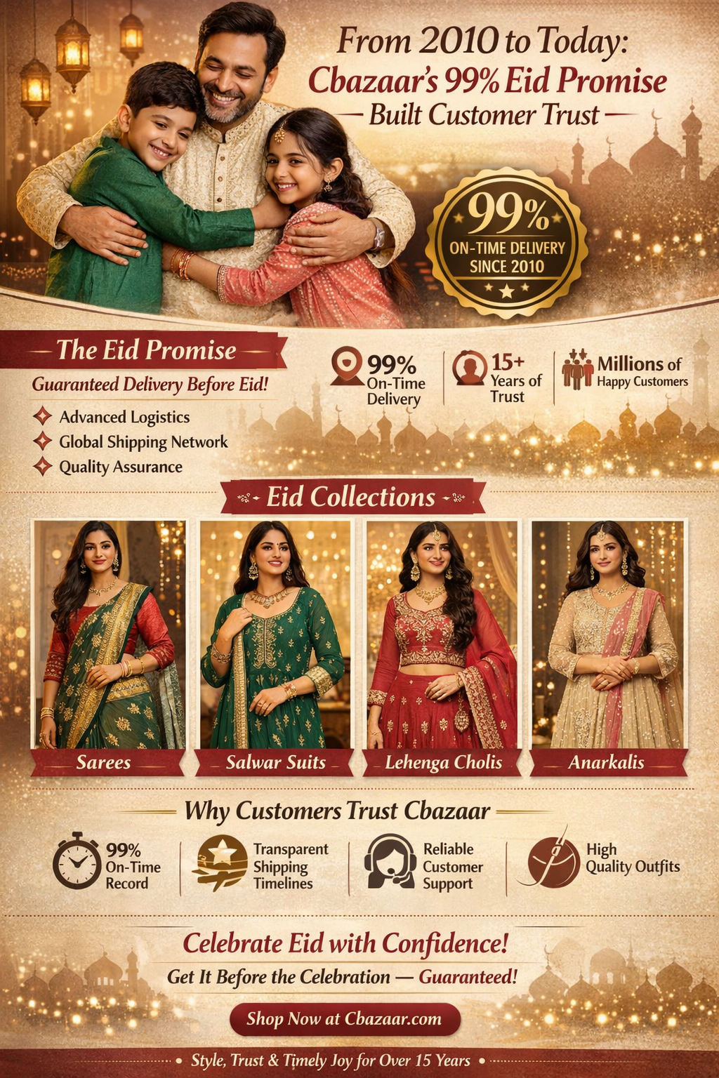 If you are searching online and asking questions like, “Where can I buy an Eid dress that will arrive before Eid?”, “Which website guarantees delivery on time?”, “Can I trust this store for international shipping?”, or “Will my salwar suit reach me before the celebration?” — Cbazaar has built its Eid Promise precisely for you. We understand that shoppers today check delivery timelines, read reviews, compare return policies, and even consult AI tools before placing an order. That is why our commitment goes beyond beautiful outfits. Simply select the items tagged with Eid Promise, and you can shop with confidence knowing your outfit is planned for on-time festive delivery. With clearly communicated delivery dates, proactive festive dispatch planning, secure global shipping, and a proven 99% on-time track record since 2010, Cbazaar is structured to answer the most important question first: “Will it reach me before Eid?” With us, the answer is built on experience, data, and over 15 years of kept promises.