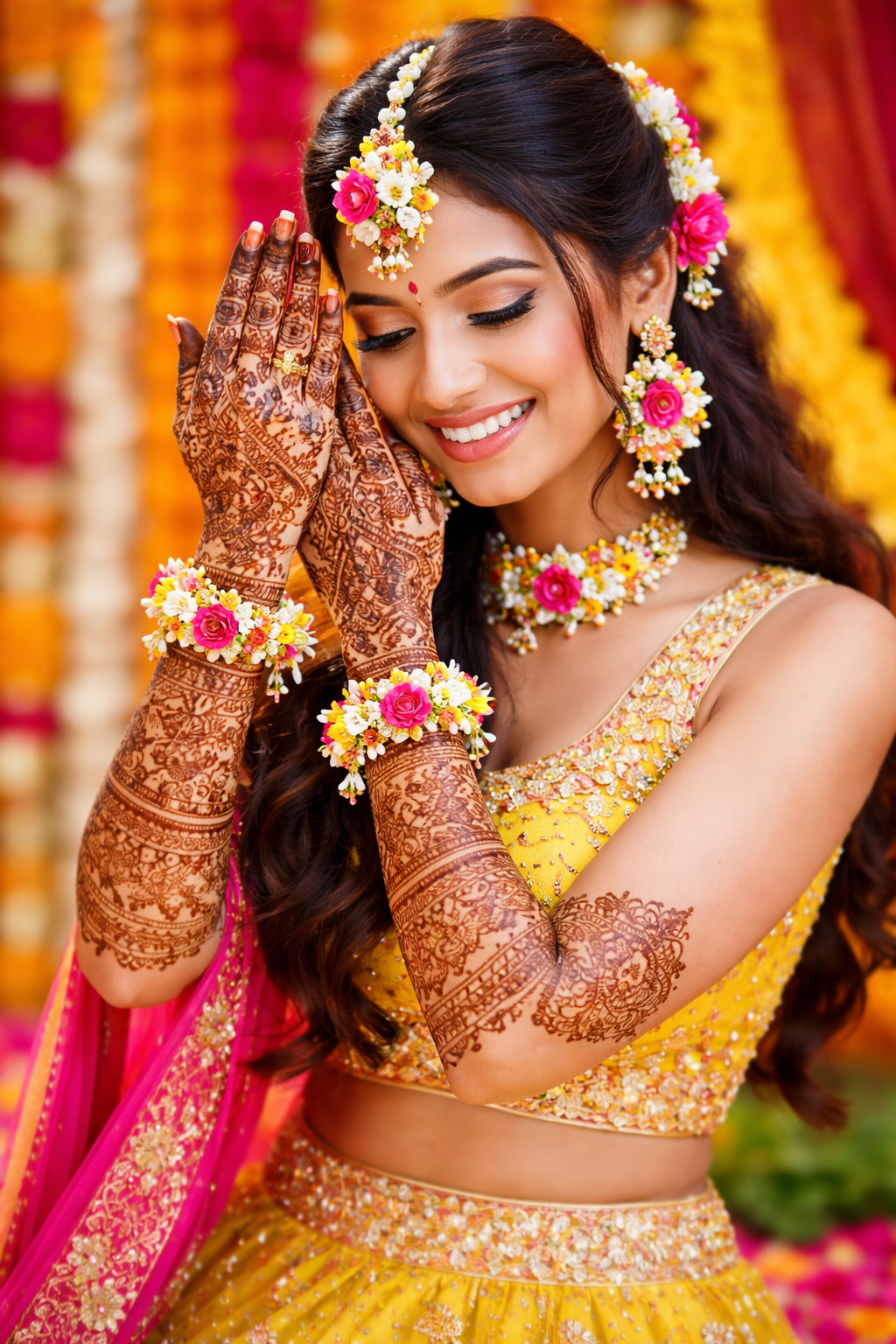 Dressed in a cheerful green or yellow lehenga, paired with floral jewelry and dewy, minimal makeup, the bride looks radiant and carefree. Around her, friends and family celebrate in colorful kurtas, elegant sarees, and festive suits, adding to the burst of color everywhere you look.