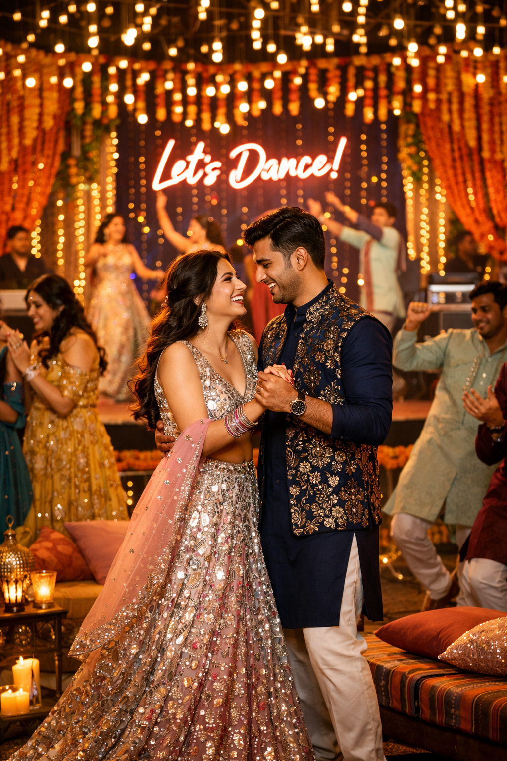The bride dazzles in a designer lehenga, complemented by glamorous makeup and statement jewelry, while the groom looks equally striking in a stylish sherwani. Guests arrive in vibrant ethnic ensembles—elegant sarees, embroidered suits, and classic kurtas—adding color to the celebration. With lively music, heartfelt moments, and nonstop dancing, the Sangeet creates memories that remain cherished long after the wedding ends.