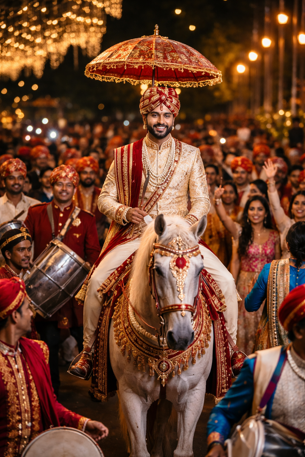The celebrations begin with the Baraat, as the groom arrives in royal style, dancing joyfully to energetic dhol beats. Surrounded by family and friends, he wears a regal sherwani, a neatly tied safa, and traditional mojris. The atmosphere is filled with excitement, laughter, and pride, setting a festive tone for the day.