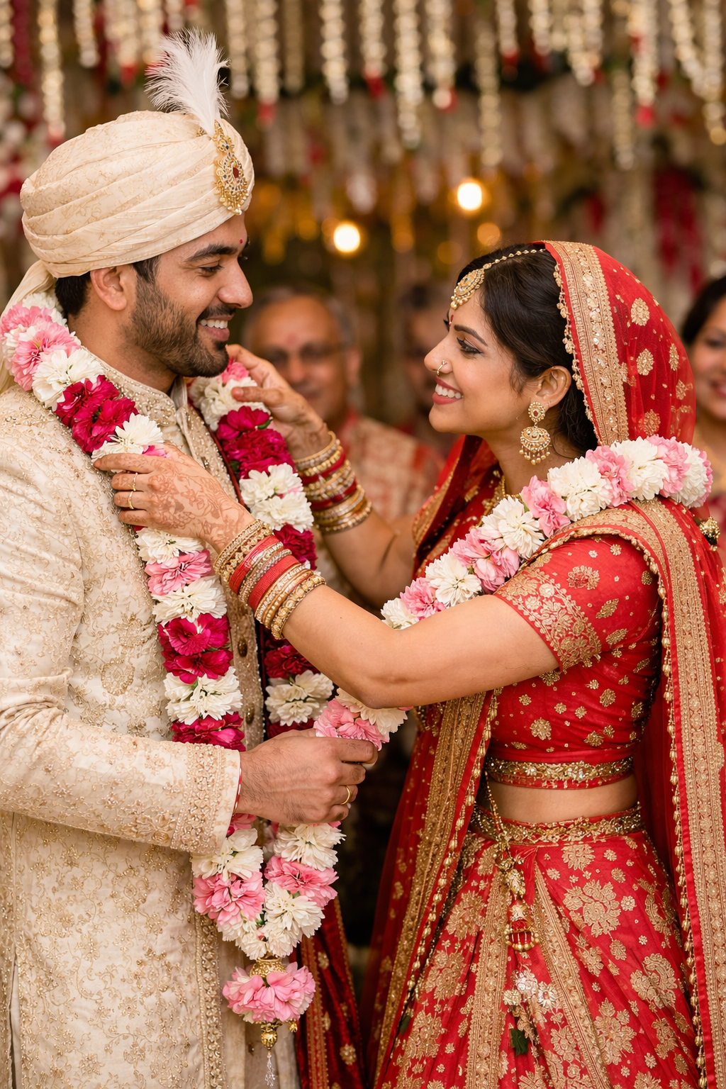 During the Jaimala ceremony, the bride and groom exchange floral garlands, accepting each other as life partners. The bride looks breathtaking in her bridal lehenga, adorned with intricate jewelry and radiant confidence, while the groom complements her elegance perfectly. This moment captures love, commitment, and the promise of a shared future.