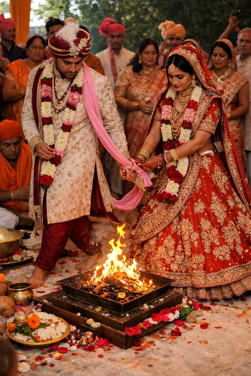 The wedding fire, or Agni, is considered a divine witness. As the couple takes seven pheras around it, they make seven promises—nurturing love, mutual trust, respect, prosperity, family values, shared responsibilities, and eternal togetherness. Each round strengthens their bond and reminds them of unity through every phase of life.