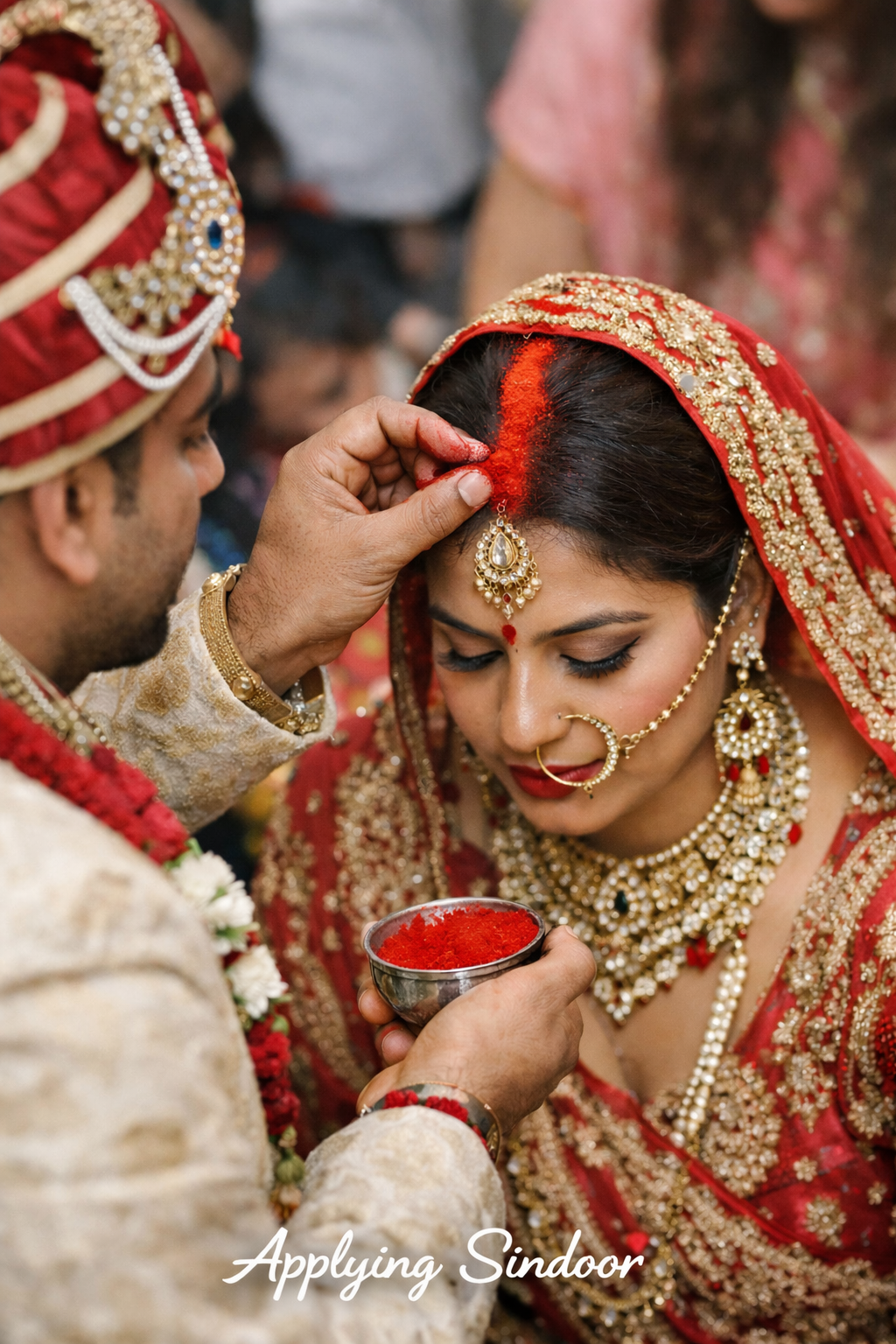 The groom tying the Mangalsutra and applying sindoor marks the sacred union. These symbols represent protection, devotion, and the bride’s new marital identity, signifying love, commitment, and lifelong partnership.