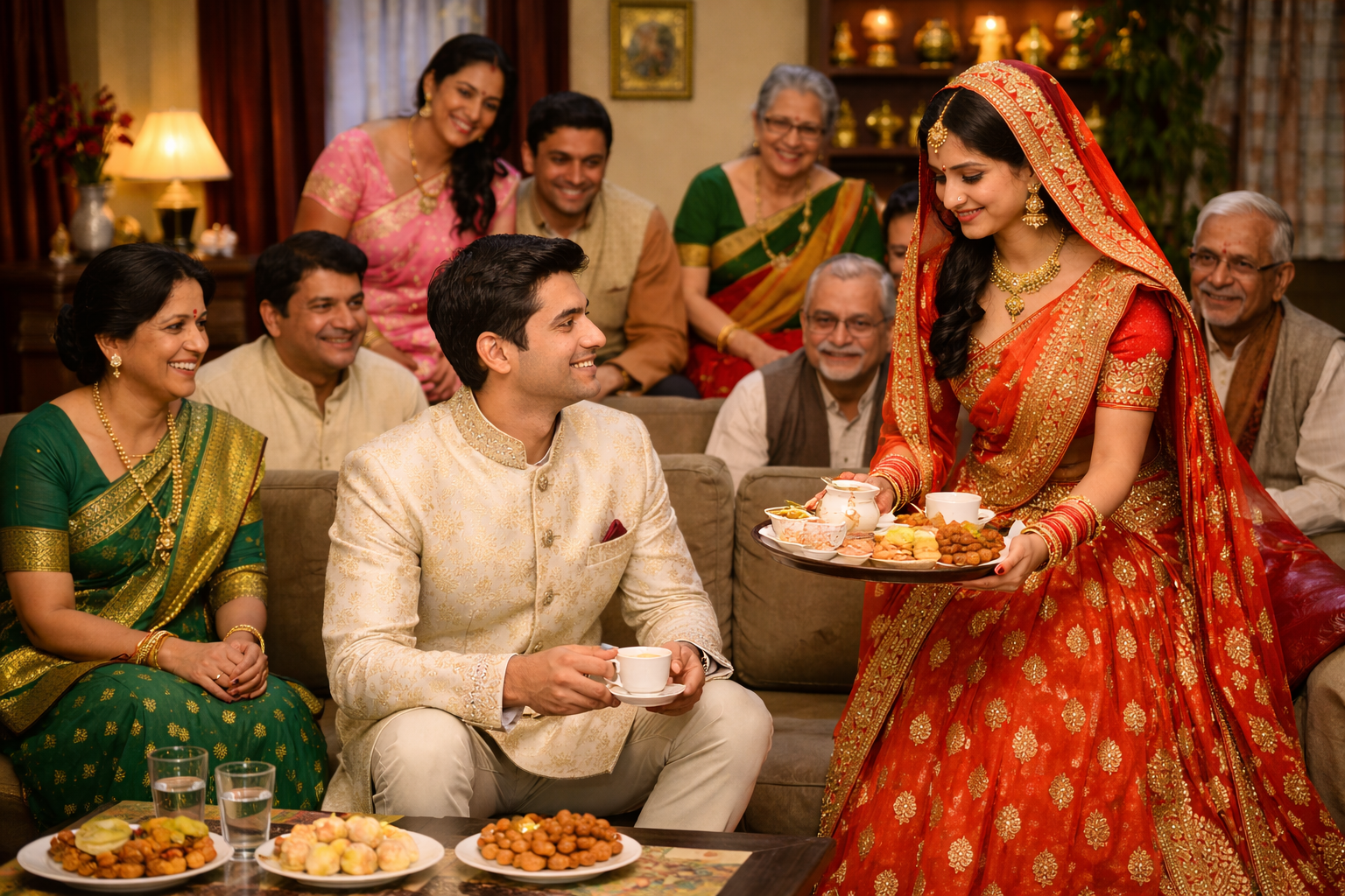 For rituals like Griha Pravesh or reception, women can wear elegant sarees or semi-heavy lehengas, while men can choose lighter sherwanis or formal kurta-pajama sets. Subtle jewelry and light fabrics ensure comfort