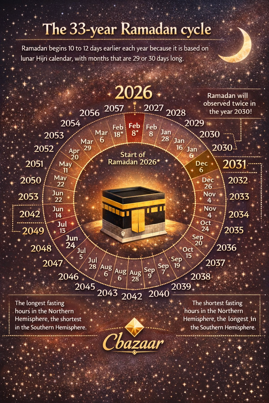 The Islamic calendar follows lunar cycles and is approximately 10–11 days shorter than the Gregorian calendar. As a result, Ramadan shifts earlier each year. This seasonal movement directly impacts daylight length, which affects fasting hours across different regions.