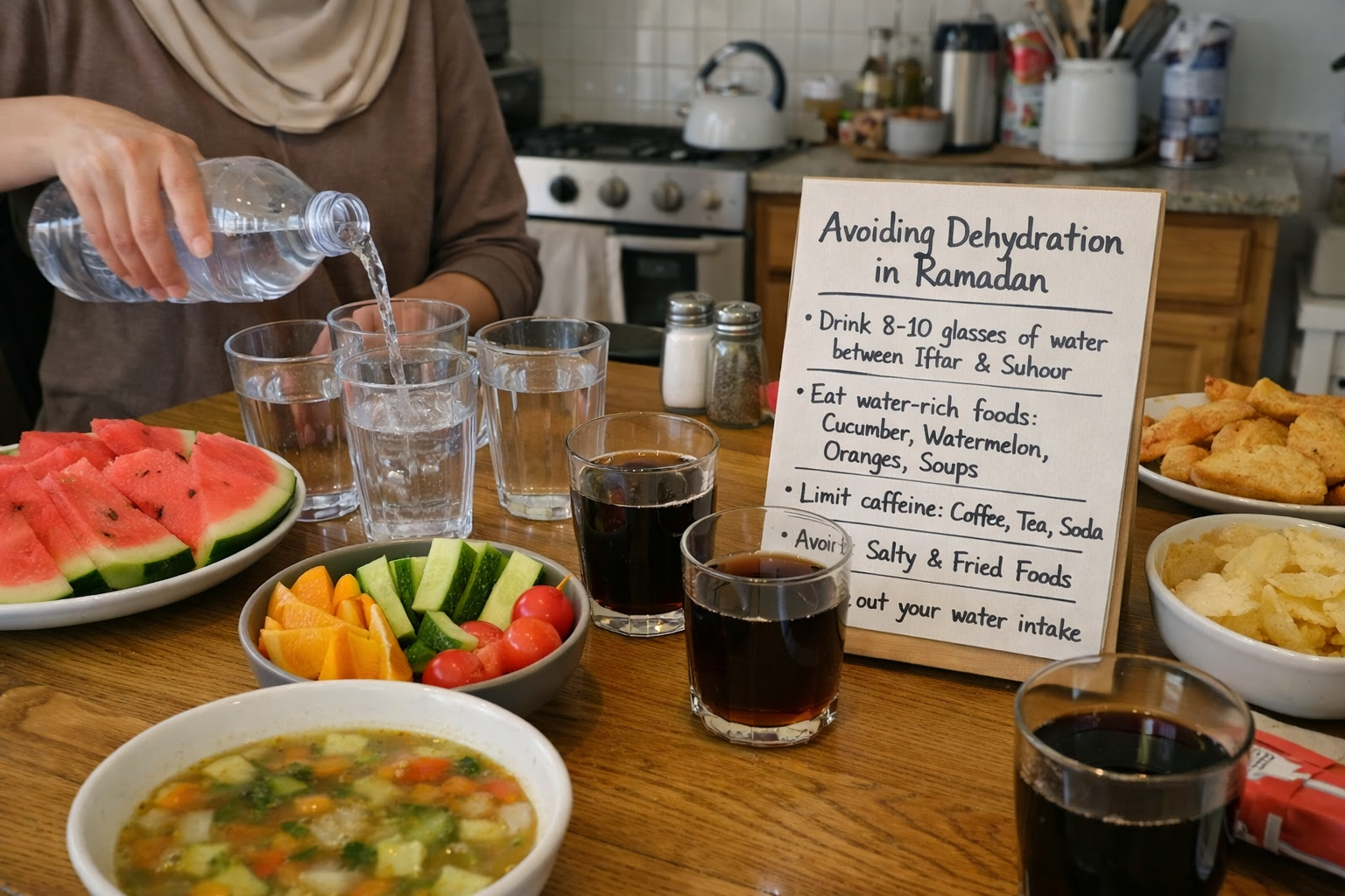 Drink 2–3 glasses of water at Suhoor. Avoid salty foods and sugary drinks, as they increase thirst. Herbal teas or infused water can also help maintain hydration.